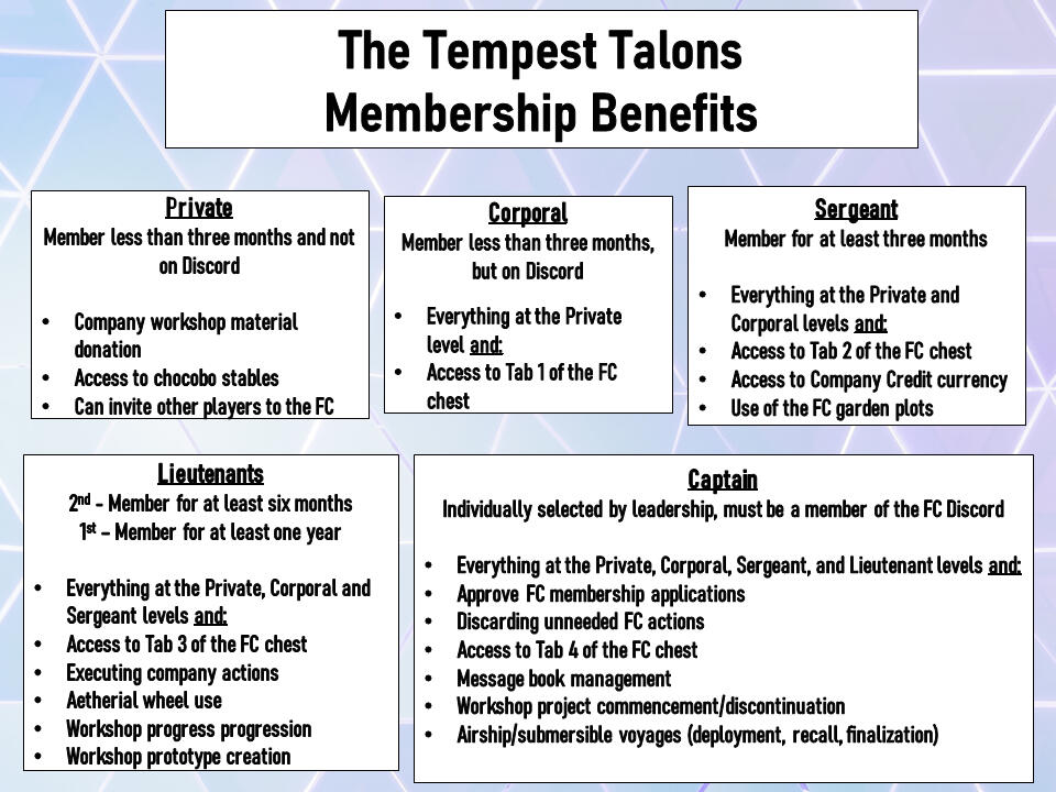 The Tempest Talons have the following member ranks: Commander, Vice Commander, Captain, First Lieutenant, Second Lieutenant, Sergeant and Private. Commander and Vice Commander are leadership ranks.Captains who are inactive for 90+ days will be reverted to their tenure-based rank.